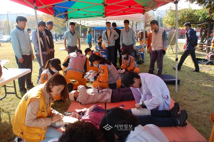 경기 안성소방서는 29일 오전 안성시 공단1로에 위치한 ㈜태평약제약에서 안성시, 안성경찰서, 안성보건소 등 16개 유관기관 252명이 참여한 가운데 ‘2014년 재난대비 긴급구조종합훈련’을 실시했다. 사진은 인명구조·구급 훈련 중인 모습. (사진제공=안성소방서)