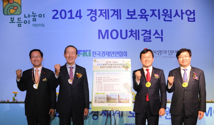 지난 28일 여의도 전경련회관에서 열린 '행궁동 어린이집 신축 MOU 체결식'에서 염태영 수원시장(오른쪽에서 첫번째)이 김주현 사회복지공동모금회 사무총장, 허창수 전경련회장, 김용남 국회의원(왼쪽부터)과 함께 기념촬영을 하고 있다.(사진제공=수원시청)