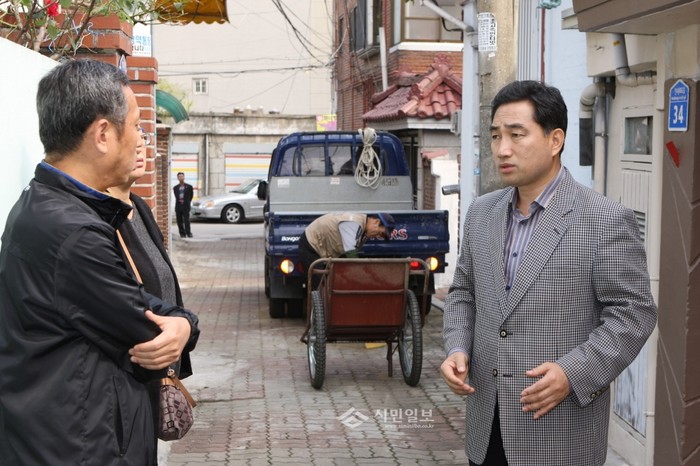 서울 강북구의회 이백균 의원이 지난 28일 강북구 수유동 통신· 한전주 민원 관련 현장활동을 벌였다. 사진은 주민, 구청측 직원과 함께 현장을 둘러보고 있는 이 의원(오른쪽)의 모습. (사진제공=강북구청)