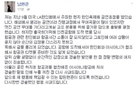팝핀현준은 자신의 페이스북을 통해 “한인회와 아시아나가 협조가 잘 안돼 욱한마음에 올렸다”며 “앞뒤 상황 설명 없이 순간적인 감정으로 경솔한 발언을 한 점 정말 변명의 여지없이 죄송하다”고 반성했다.