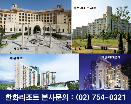 4계절 종합휴양 리조트인 한화리조트는 국내외 13개 직영체인(설악쏘라노• 대천해운대• 해운대티볼리• 산정호수안시• 평창스파크스키장•경주에톤•제주•지리산•용인•양평•수안보•백암온천)과 해외 사이판 월드리조트 및 제휴리조트(강촌•해남•거제•여수)를 운영 중이다. 이같이 국내 최고시설, 최다 체인을 보유, 또한 지역별 제휴 리조트가 많아 휴가지 선택의 고민을 줄여 준다.