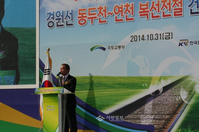 '경기북부의 새시대, 함께하는 녹색철도'라는 슬로건으로 '경원선 동두천~연천 복선 전철 건설사업 기공식'이 31일 연천 전곡역에서 김규선 연천군수를 비롯해 연천포천지역 김영우 국회의원, 양주동두천지역 정성호 국회의원, 강영일 한국철도시설공단 이사장과 지역주민 등이 참석한 가운데 열렸다.