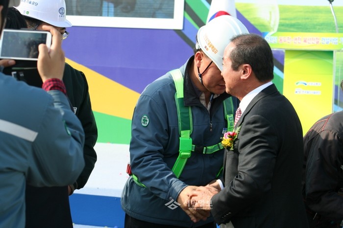 사진은 공사 관계자와 악수중인 김규선 연천군수의 모습.