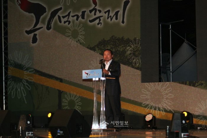 김규선 연천군수가 구석기축제 특설무대에서 개막을 선언하고 있다.