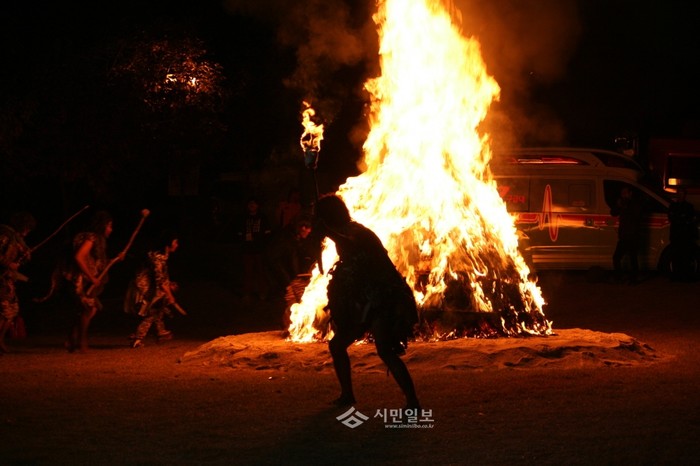구석기인으로 분장을 한 공연 관계자들이 캠프파이어 주변을 도는 퍼포먼스를 선보이고 있다.