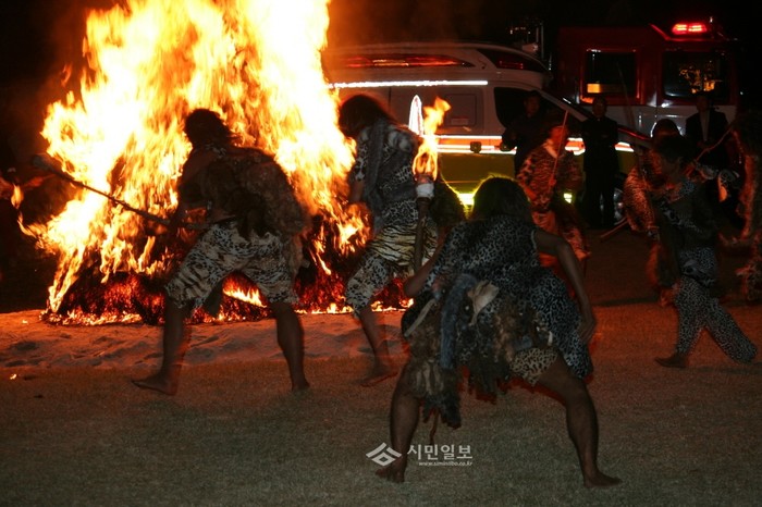 구석기인으로 분장을 한 공연 관계자들이 캠프파이어 주변을 도는 퍼포먼스를 선보이고 있다.