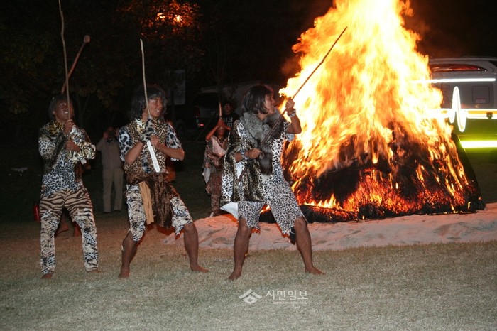 구석기인으로 분장을 한 공연 관계자들이 캠프파이어 주변을 도는 퍼포먼스를 선보이고 있다.