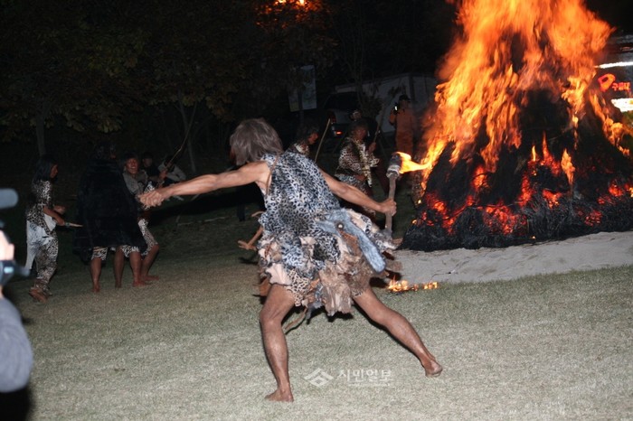 구석기인으로 분장을 한 공연 관계자들이 캠프파이어 주변을 도는 퍼포먼스를 선보이고 있다.