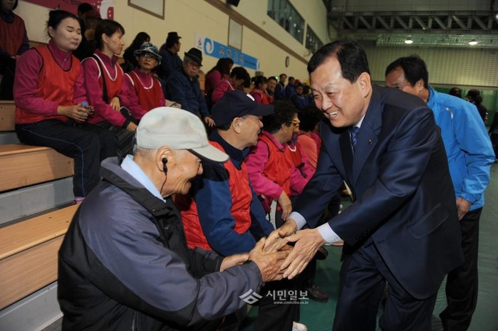이교범 경기 하남시장이 장애인 체육 활성화와 건강증진 도모를 위해 하남시 장애인체육회가 주최한 ‘제2회 하남시 장애인 체육대회’가 열린 하남종합운동장 실내체육관을 찾아 관계자들을 격려하고 있다. (사진제공=하남시청)