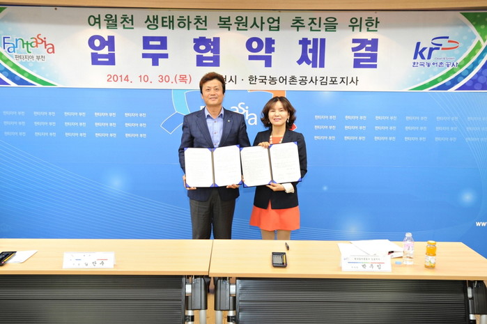 지난달 30일 경기 부천시는 종합적인 치수대책을 마련하고 주민편의 시설을 확충하는 등 물로 행복해지는 생태문화 공간 창출을 위해 한국농어촌공사 김포지사와 여월천 생태하천 복원사업 관련 업무협약을 맺었다. 사진은 업무 협약식 기념촬영 모습 (사진제공=부천시청)