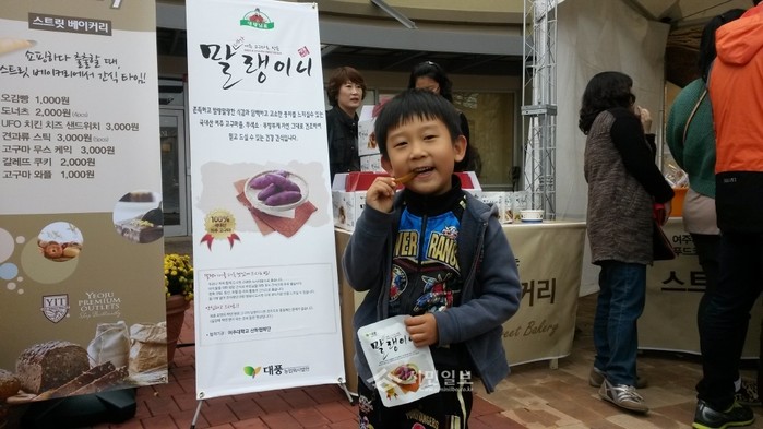 농업회사법인 '대풍'은 지난 1일 경기 여주시 여주프리미엄아울렛에서 농촌진흥청과 경기도농업기술원, 그리고 여주시농업기술센터 지원을 받아 만든 고구마 말랭이 제품 '말랭이니'를 소비자에게 선보였다. 사진은 행사에 참가한 아이가 '말랭이니'를 먹고 있는 모습. (사진제공=여주시청)