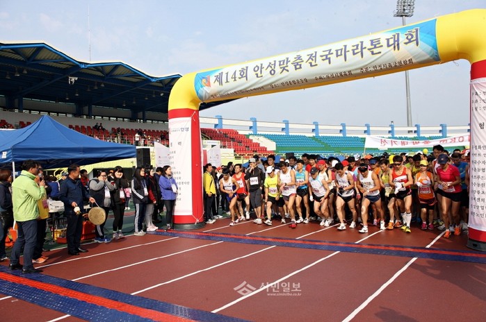 지난 2일 경기 안성시 안성종합운동장에서 1500여명의 동호인이 참여한 가운데 '제14회 안성맞춤 전국 마라톤대회'가 열렸다. 이 대회는 하프(21km), 단축(10km), 건강달리기(5km)의 3개 부문으로 진행됐고 입상자에게 부상이 수여됐다. 사진은 경기를 시작하는 선수들의 모습.(사진제공=안성시청)
