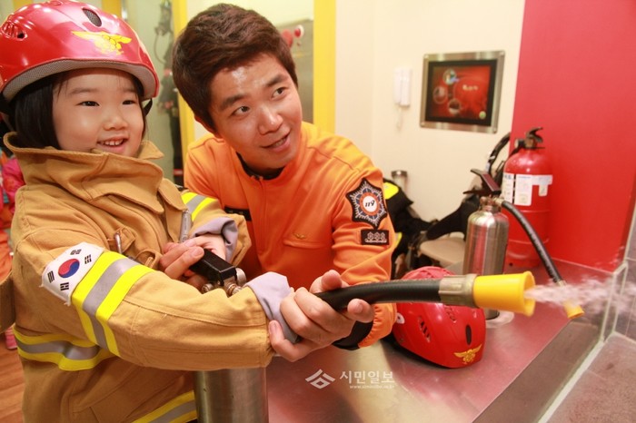 4일 서울 구로소방서는 구로구 소재 ‘롯데어린이집’ 원생들을 초청해 소방서 3층 소방안전체험교실에서 '1일 병아리 소방관 체험학습'을 진행했다. 사진은 이날 소방관의 지도 아래 물소화기를 사용한 가상화재 진압 중인 어린이의 모습. (사진제공=구로소방서)