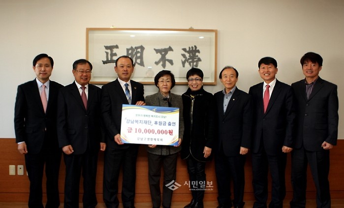 신연희 강남구청장(가운데)이 5일 오전 10시 강남구청에서 강남구 생활체육회 이사회로부터 위기가정을 발굴·지원 하는 등 복지사각지대 해소를 위한 강남복지재단 후원금 1000만원을 전달받고 기념촬영을 하고 있다. (사진제공=강남구청)