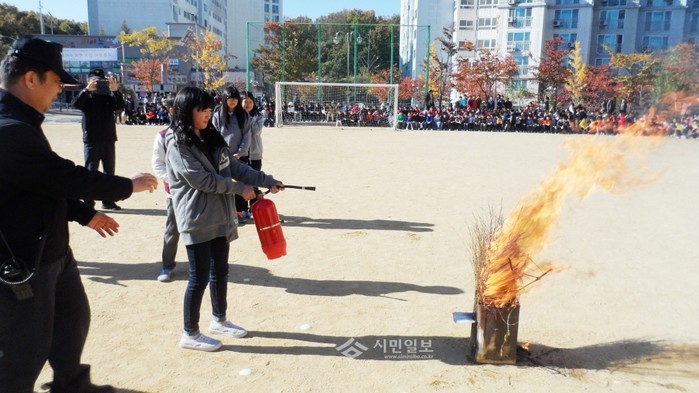 최근 경기 부천시 성곡초등학교는 원종 119 안전센터와 함께 불조심 강조의 달을 맞아 전교생과 전직원을 대상으로 화재에 대한 경각심을 높이고 화재사고 대비를 위한 소방안전 훈련을 실시했다. 사진은 모의화재현장을 향해 소화기를 분사하는 학생의 모습. (사진제공=부천교육지원청)