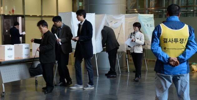 서울시 공무원노동조합총연맹 회원들이 5일 오전 서울시청에서 새누리당의 공무원 연금법 일부 개정법률안에 대한 공노총 100만 공무원 찬반투표를 진행하고 있다.