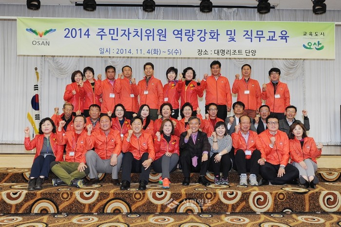 경기 오산시는 이달 4·5일 충북 단양 대명리조트에서 곽상욱 오산시장과 문영근 시의회 의장 등 관계자 130여명이 참석한 가운데 '2014년 주민자치위원 역량강화 및 직무교육'을 실시했다. 사진은 곽 시장과 참석자들이 함께 기념촬영하는 모습.(사진제공=오산시청)