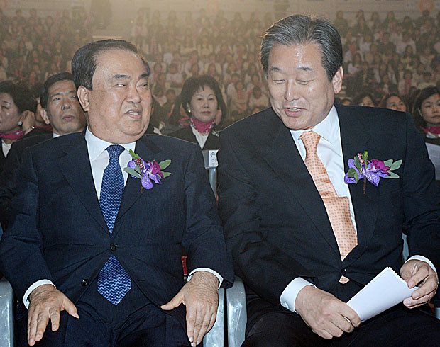 김무성 새누리당 대표(오른쪽) 와 문희상 새정치민주연합 비상대책위원장이 2014 간호정책 선포식이 열린 6일 오후 서울 올림픽공원 핸드볼경기장에서 대화를 나누고 있다.
