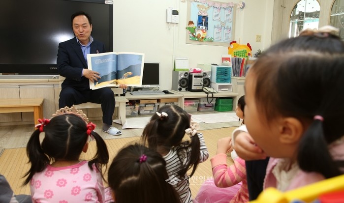 경기 안양시가 '인문학 도시 조성사업'의 일환으로 간부급 공무원들이 유치원과 초등학교를 방문해 동화구연 활동을 펼치는 '책 읽어주기 사업'을 추진 중인 가운데 6일 이필운 시장이 안양초등학교 병설유치원을 찾아 아이들에게 동화책을 읽어주고 있다. (사진제공=안양시청)