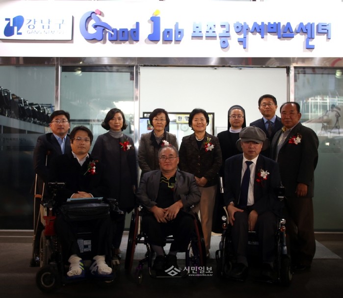 최근 중증장애인에게 필요한 보조공학기구의 보급·임대·수리 서비스를 제공하는 서울 강남구 역삼동 ‘Good Job 보조공학서비스센터’의 개소식에 참석한 신연희 강남구청장(뒷줄 왼쪽에서 세번째)이 내빈들과 기념촬영을 하고 있다.(사진제공=강남구청)