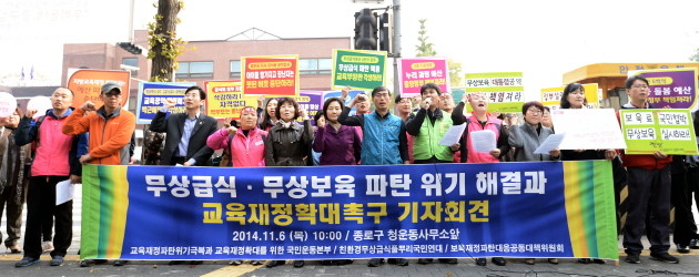 교육재정파탄위기극복과 교육재정확대를 위한 국민운동본부를 비롯한 시민사회단체 회원들이 6일 오전 서울 종로구 자하문로 청운효자동사무소 앞에서 무상보육·무상급식 파탄위기 대통령 해결 촉구 기자회견을 열고 구호를 외치고 있다.