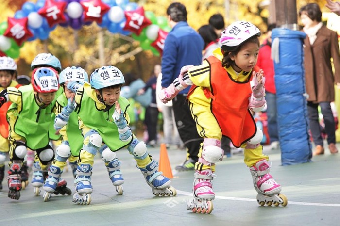 지난 7일 서울 성동구가 서울숲 체육공원 스케이트파크장에서 지역내 보육시설 어린이들에게 신체활동의 즐거움을 느끼게 하고 성취감을 높이기 위한 '몸튼튼 마음튼튼 어린이 신체활동 늘리기' 사업의 일환으로 '제6회 성동 어린이 인라인 스케이트 대회'를 개최했다. 사진은 참여 어린이들이 질주중인 모습.(사진제공=성동구청)
