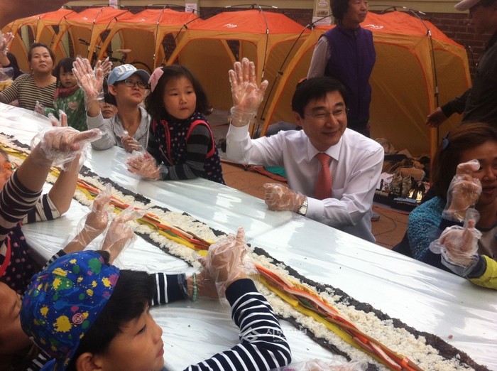 최근 서울 도봉구 방학2동에서 '제9회 골목대장터'가 열렸다. 이 행사에서는 벼룩장터, 직조체험, 500㏄ 맥주 빨리 마시기, 여자팔씨름 대회, 62m 김밥 만들기 등이 진행됐다. 사진은 62m 김밥 만들기 행사에 참석한 이동진 도봉구청장(오른쪽에서 두번째)이 아이들과 함께 김밥을 말고 있는 모습. (사진제공=도봉구청)