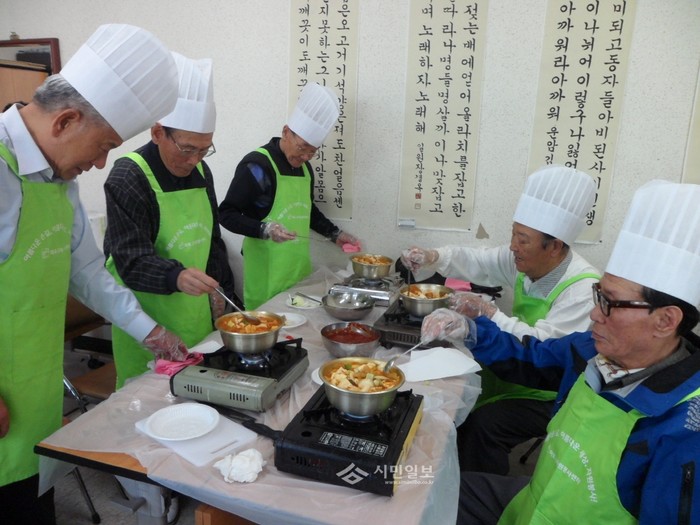 최근 서울 마포구 상암동은 동 주민센터에서 지역내 저소득 홀몸 남성노인을 대상으로 결식 예방과 건강한 식생활 향상을 위한 ‘어르신 웰빙 요리강습’을 개최했다. 사진은 이날 교육에 참가한 노인들이 요리기초 교육을 이수한 후 직접 김치찌개를 조리하고 있는 모습. (사진제공=마포구청)