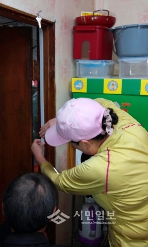 서울 서대문구 북아현동 지역사회 복지협의체 위원, 복지동·통장들이 겨울을 앞두고 지역내 저소득 홀몸노인의 ‘따뜻한 겨울나기’를 돕고자 홀몸노인 가구를 방문해 문에 방풍테이프를 부착하고 있다. (사진제공=서대문구청)