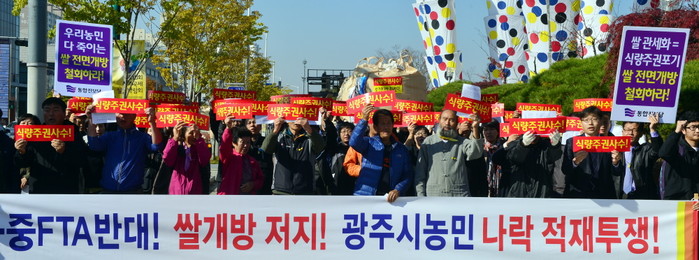 10일 오전 광주 서구 광주시청 앞에서 전국농민회총연맹 광주시농민회가 '한·중FTA 중단과 쌀 전면개방저지, 나락값 보장' 등을 촉구하고 있다.