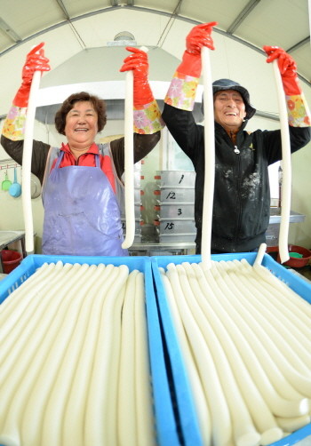 10일 경남 거창군 주상면 해맞이 식품 김영조씨 부부가 가래떡 데이(11월 11일)에 선물 할 가래떡을 뽑고 있다.