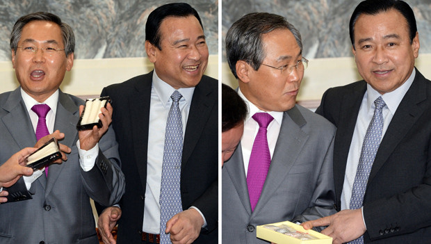 11일 오전 서울 여의도 국회 운영위원장실에서 새누리당과 새정치민주연합의 양당 원내대표 회동이 열린 가운데 인사를 마친 우윤근 새정치민주연합 원내대표(왼쪽)가 가래떡을 들고 새정치쪽에서 준비한 떡이라고 설명하고 있다. 이에 앞서 우 원내대표가 새누리당 쪽에서 준비한 떡을 들고 새정치민주연합에서 준비했다고 하자, 이완구 새누리당 원내대표가 새누리쪽에서 준비한거라고 알려주는 해프닝이 있었다.