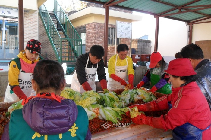 지난 10일 경기 포천시 이동면 남녀새마을지도자들이 직접 재배한 배추로 지역내 어려운 이웃을 돕기 위한 '사랑의 김장 담그기 행사'를 실시했다. 이날 만든 김치는 10kg 200상자 분량으로 지역내 저소득 주민들에게 전달될 예정이다. 사진은 김치를 담그는 참여자들의 모습.(사진제공=포천시청)