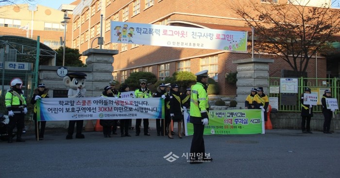 인천 서부경찰서는 12일 지역내 경서초등학교에서 어린이들의 안전한 하굣길 조성을 위해 교통경찰, 녹색어머니회, 경서초등 학교장 등 40여명이 함께 캠페인을 실시했다. 사진은 이날 캠페인에 참가한 관계자들이 홍보활동을 펼치는 모습. (사진제공=서부경찰서)
