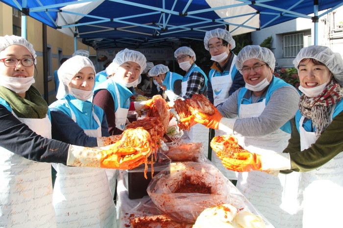 [시민일보=박기성 기자] 12일 SPC그룹 임직원 30여명이 서울 서초구 양재동 양재노인종합복지관에서 김장나누기 봉사활동을 실시했다. 이들은 배추 500포기를 김장김치로 만들어 방한용품과 함께 지역내 120가정에 전달했다. 사진은 봉사활동 참여자들이 만든 김치를 들어보이는 모습.