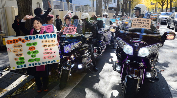 학교를 사랑하는 학부모 모임 등 관계자들이 12일 오전 서울 종로구 정부서울청사 후문에서 열린 '2015 수능 수험생 수송 자원봉사 발대식 기자회견'에서 파이팅을 외치고 있다. 이들은 2015학년도 수능 대박을 기원하며 '수능문제 출제 오류 NO!'라는 문구로 수능 수험생들의 시험 안전을 촉구했다. 동시에 수능 수험생 수송 신고센터를 운영(02-737-5184), 수능일 거동이 불편하거나 몸이 아픈 수험생들의 접수를 받아 각 고사장까지 수송 자원 봉사를 할 계획이다.