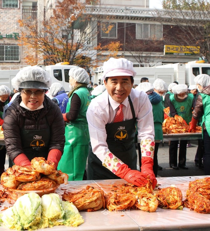 서울 강동구의회 성임제 의장은 지난 11일 강동 구민회관에서 열린 '새마을부녀회 사랑의 김장나누기 행사'에 참석, 소외된 이웃들을 위해 직접 김장을 담그는 부녀회원, 다문화 가정 주민들을 격려했다. (사진제공=강동구의회)