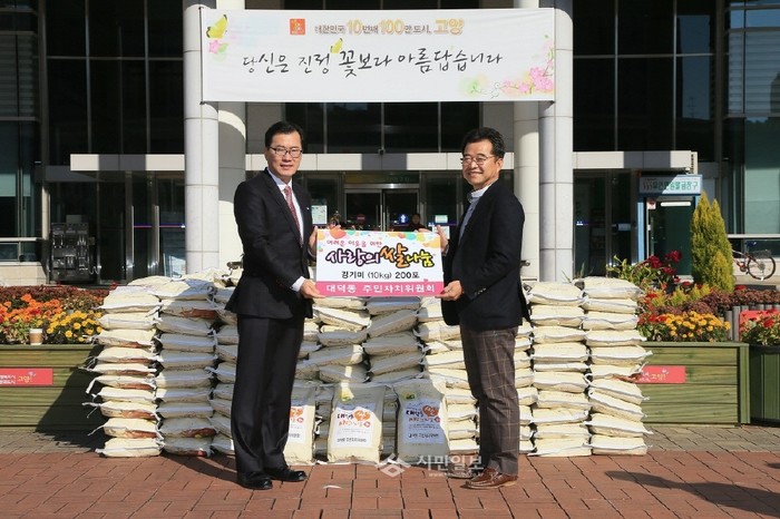경기 고양시 대덕동은 어려운 이웃들의 따뜻한 겨울나기 지원을 위해 12일 덕양구청 광장에서 이상영 구청장, 서병하 대덕동장, 김순철 시민복지과장과 대덕동주민자치위원회 임원 등 10여명이 참석한 가운데 ‘사랑의 쌀 전달식’을 진행했다. 사진은 대덕동 주민자치위원장이 이 구청장(왼쪽)에게 쌀을 전달한 후 기념촬영한 모습. (사진제공=고양시청)