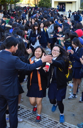 수능 예비소집일인 12일 오전 서울 풍문여고에서 1, 2학년 학생들이 3학년 수험생들을 위한 장행식을 하며 응원하고 있다.
