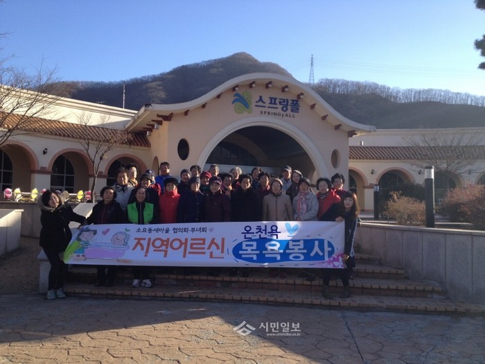 경기 동두천시 소요동 새마을 협의회·부녀회에서는 13일 포천 신북온천의 후원으로 지역내 4통·5통·15통 경로당 노인 30명을 대상으로 '목욕봉사 사업'을 실시했다. 사진은 목욕봉사를 끝낸 후 경로당노인들과 봉사자들이 기념촬영한 모습. (사진제공=동두천시청)