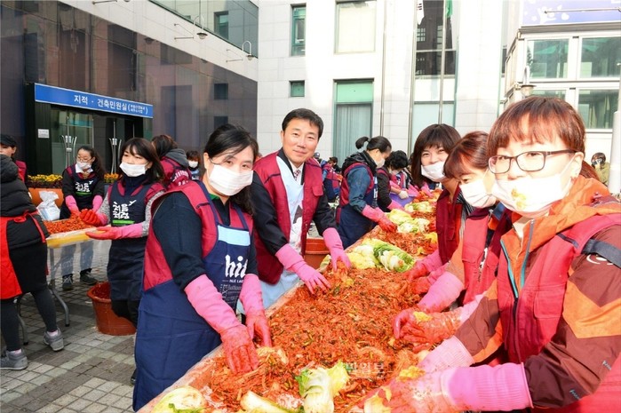 지난 11일 서울 중랑구의회는 구청 광장에서 열린 중랑구 초등운영위원장 협의회 주최로 열린 '2014 사랑의 김장 나눔행사'에 동참했다. 이날 담근 김치는 23개 초등학교 저소득층 가구 및 자매결연 학생 등 500여가구에 전달됐다. 사진은 서인서 의장(가운데)이 회원들과 함께 김장을 하고 있는 모습. (사진제공=중랑구의회)