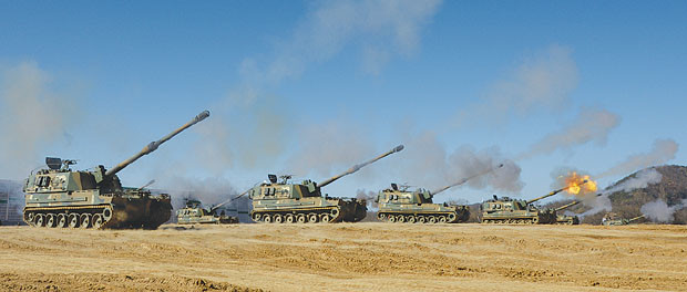 2014 호국훈련 기간인 13일 경기 연천군 꽃봉훈련장에서 육군 6군단 예하 포병여단이 전면전 대비 K-9 자주포 실사격 훈련을 하고 있다. 이날 훈련은 2015 학년도 대입수학능력시험에 지장을 주지 않기 위해 점심시간에 맞춰 진행됐다. 호국훈련은 지난 1996년부터 육군, 해군, 공군간 합동성을 높이기 위해 매년 실시되는 한국군 단독의 최대규모 합동훈련으로 오는 21일까지 계속된다.