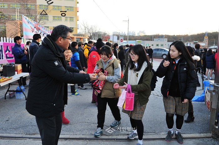 원경희 경기 여주시장은 2015학년도 대학수학능력시험일인 13일, 오전 7시부터 지역내 수능시험이 치러지는 세종중학교, 여주고등학교, 세종고등학교, 여주중학교를 차례로 방문해 후배 학생들, 학부모들과 함께 "그동안 노력한 만큼 좋은 결실을 맺기를 바란다"며 응원과 격려의 메시지를 전했다. (사진제공=여주시청)