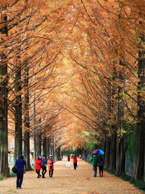 전국에서 가장 아름다운 가로수길로 관광객들의 발길이 끊이지 않는 전남 담양 메타세쿼이아길이 13일 붉게 물들며 환상적인 가을 풍경을 자아내면서 관광객들은 사진찍기에 여념이 없다.