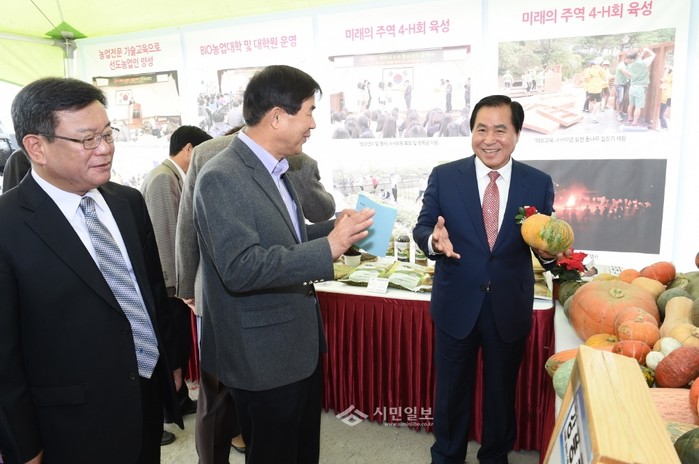 지난 11일 경기 양주시가 농업기술센터 운동장에서 농업인의 자부심을 고취하고 수확의 기쁨을 나누는 '제19회 양주시 농업인의 날 행사'가 열렸다. 이날 행사장에는 농업기술센터의 성과를 알리는 전시회도 진행됐다. 사진은 전시회장에서 관계자들과 대화를 나누는 현삼식 시장(오른쪽)의 모습. (사진제공=양주시청)
