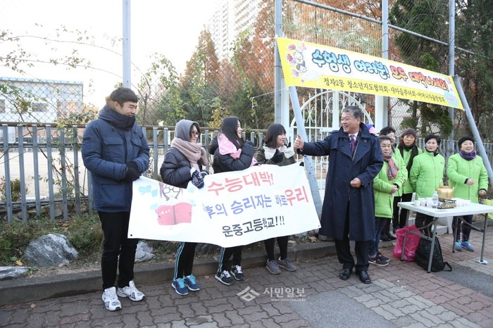 박권종 경기 성남시의장은 대학수학능력시험일인 13일 이른 아침 대진·중앙·분당경영·불곡고등학교를 방문해 입구에서 수험생들의 손을 일일이 잡아주며 격려했으며, 수험생을 응원하기 위해 추운 날씨 속에서도 자원봉사에 나선 각 단체원들에게도 고마움을 전했다. (사진제공=성남시의회)