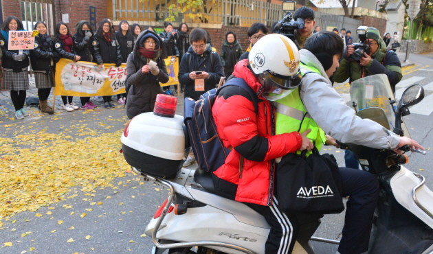 2015학년도 대학수학능력시험일인 13일 오전 서울 압구정고등학교(서울특별시교육청 제18시험지구 제22시험장)에서 고사장을 잘못 찾아온 한 수험생이 경찰 오토바이를 타고 원래 고사장으로 향하고 있다.