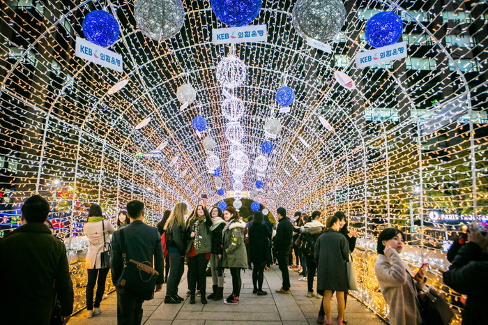 | ▲ 지난 13일 서울 청계천에서 열리는 '2014 서울 빛초롱 축제'에 참가한 많은 국내외 관광객들이 '모전교'에 설치된 외환은행 빛터널에서 만추의 정취를 만끽하고 있다. | ||