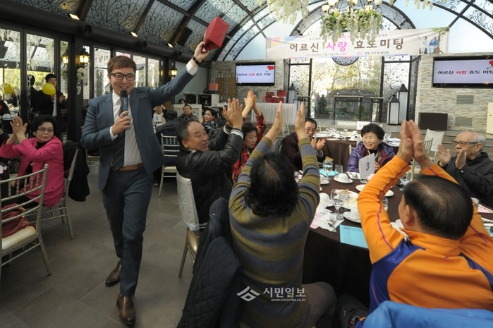 지난 13일 중구 명동 라루체 웨딩홀에서 열린 ‘효도미팅’에 참석한 60세 이상 홀몸노인 50명(남자 25명·여자 25명)이 스피드미팅, 커플게임, 그룹 빙고, 공개 프로포즈 등 다양한 레크리에이션을 하며 즐거워 하고 있다. (사진제공=중구청)