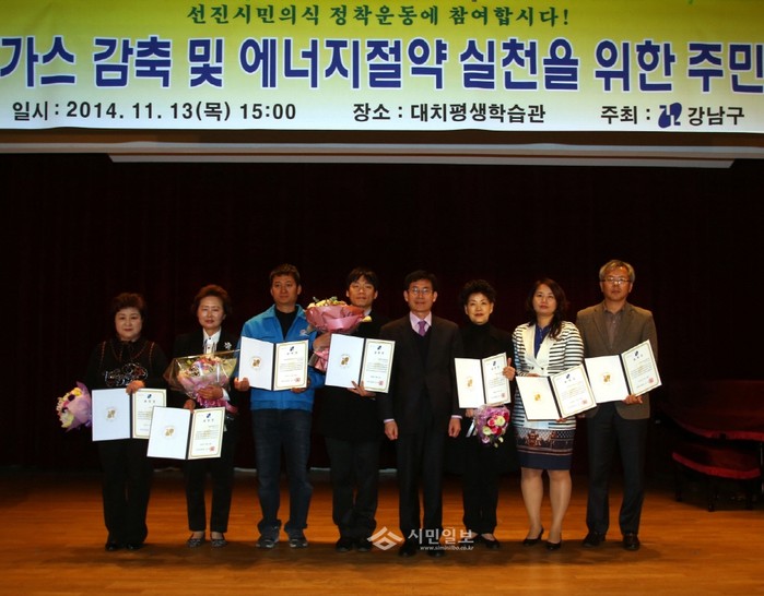 지난 13일 서울 강남구 대치평생학습관에서 열린 '온실가스 감축 확산을 위한 주민교육'에 참석한 주윤중 강남구 부구청장이 교육 전 실시된 환경유공자 표창 수여식에서 유공자들에게 표창장을 수여하고 함께 기념촬영을 하고 있다.